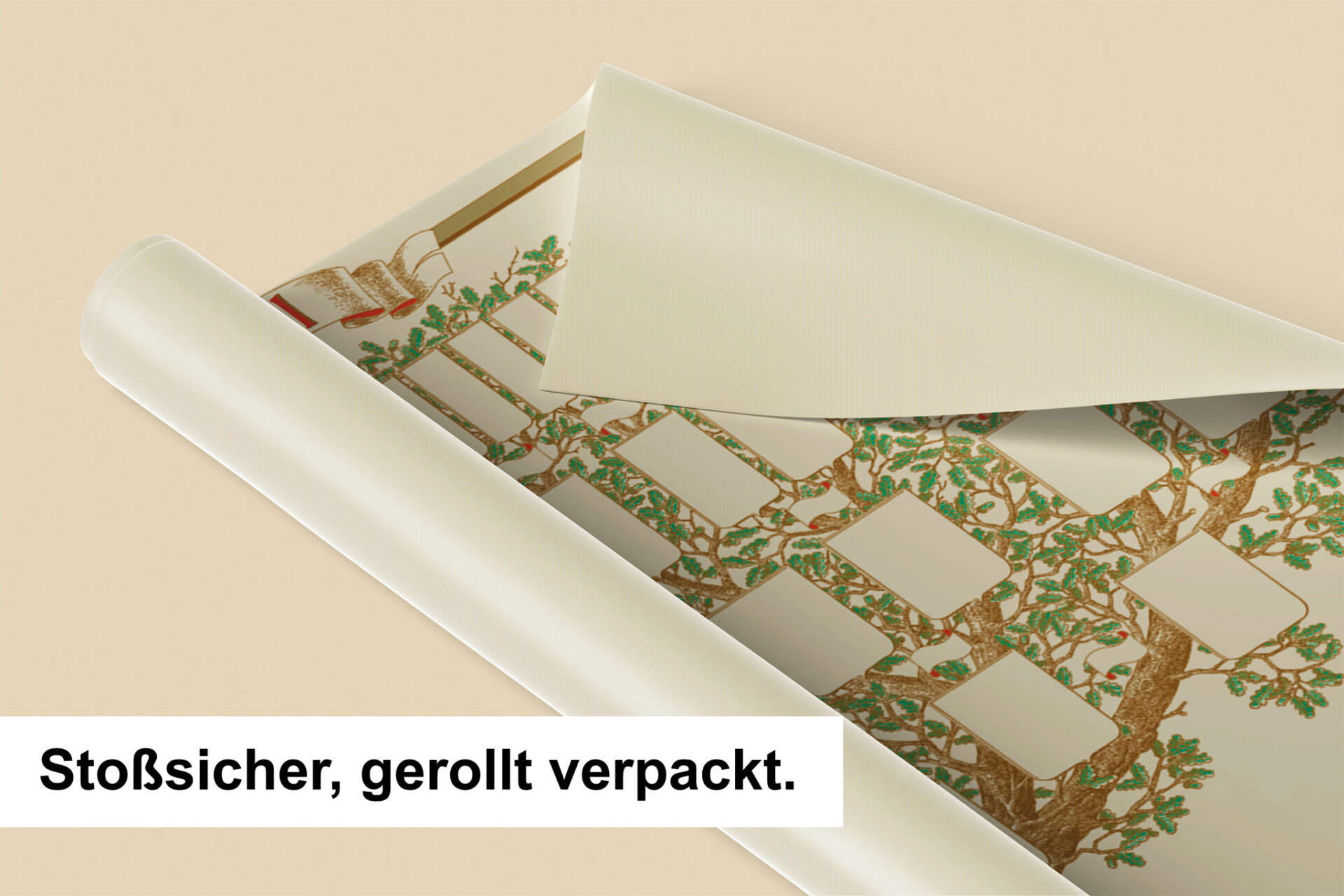 Die im Vintage-Look dargestellte Ahnentafel ist auf hochwertigem Elefantenhautpapier gedruckt. Insgesamt können bis zu 63 Personen in 6 Generationen paarweise handschriftlich angeordnet werden. Die praktische Größe von 70 x 50 cm bietet genug Platz für das Ausfüllen der Personendaten. Zu jedem Ehepaar auch kann das Hochzeitsdatum eingetragen werden. Die Ahnentafel ist stoßsicher, gerollt verpackt und enthält einen Entwurfsbogen in Originalgröße. Bei fehlerhaften Eintragungen oder Änderungen der Familiendaten, können die selbstklebenden Aufklebeschilder mit der Art. 2818 zur Korrektur genutzt werden.