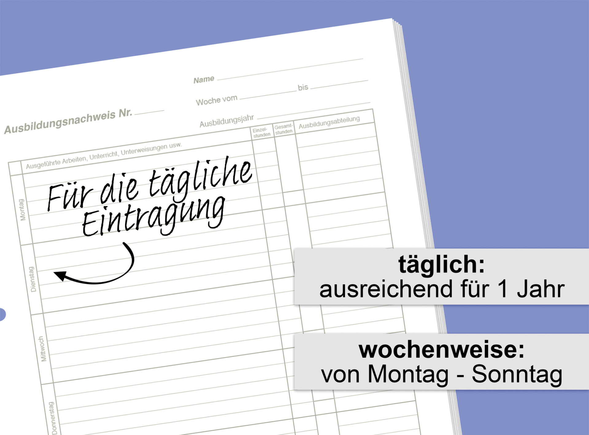 Der DIN-A4-Ausbildungsnachweisblock für tägliche Eintragungen mit Wocheneinteilung eignet sich für alle Ausbildungsberufe. Der Block deckt eine Ausbildungszeit von Montag bis Sonntag ab und ist bei täglichen Eintragungen ausreichend für ein ganzes Jahr. Enthalten sind Erläuterungen, Eintragungsbeispiele, ein betrieblicher Ausbildungsplan sowie Sichtvermerke für Berufsschule, gesetzliche Vertreter und Betriebsrat. Geeignet für alle Ausbildungsberufe und Branchen.