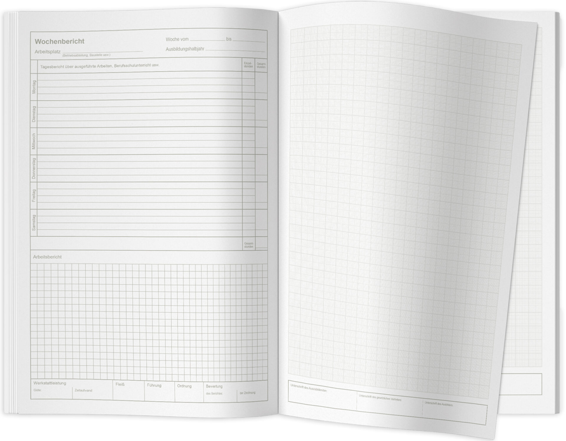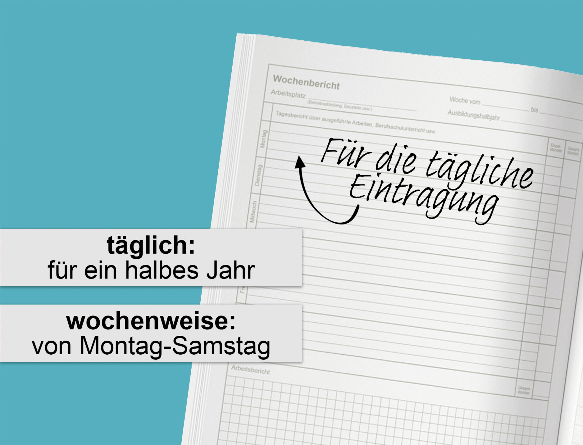 Das DIN-A4-Ausbildungsnachweisheft für tägliche Einträge mit Wocheneinteilung eignet sich für alle Ausbildungsberufe im handwerklichen Bereich. Bei täglicher Nutzung deckt das Heft einen Zeitraum von einem halben Jahr ab. Der Ausbildungsbericht ist speziell auf das Handwerk ausgerichtet. Enthalten sind umfassende Anleitungen, ein detailliertes Inhaltsverzeichnis, praxisnahe Eintragungsbeispiele, Zwischenprüfungsergebnisse und ein Skizzenblatt pro Woche in Millimeter-Einteilung für realistische Zeichnungen und Skizzen. Geeignet für Ausbildungsberufe im Handwerk.