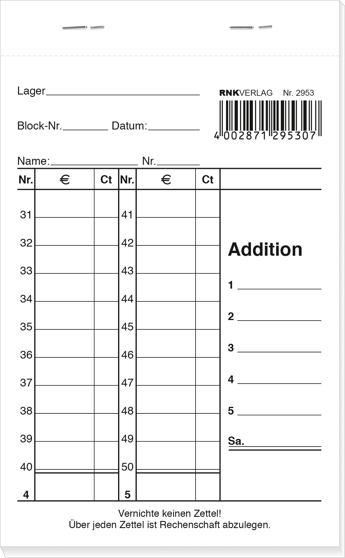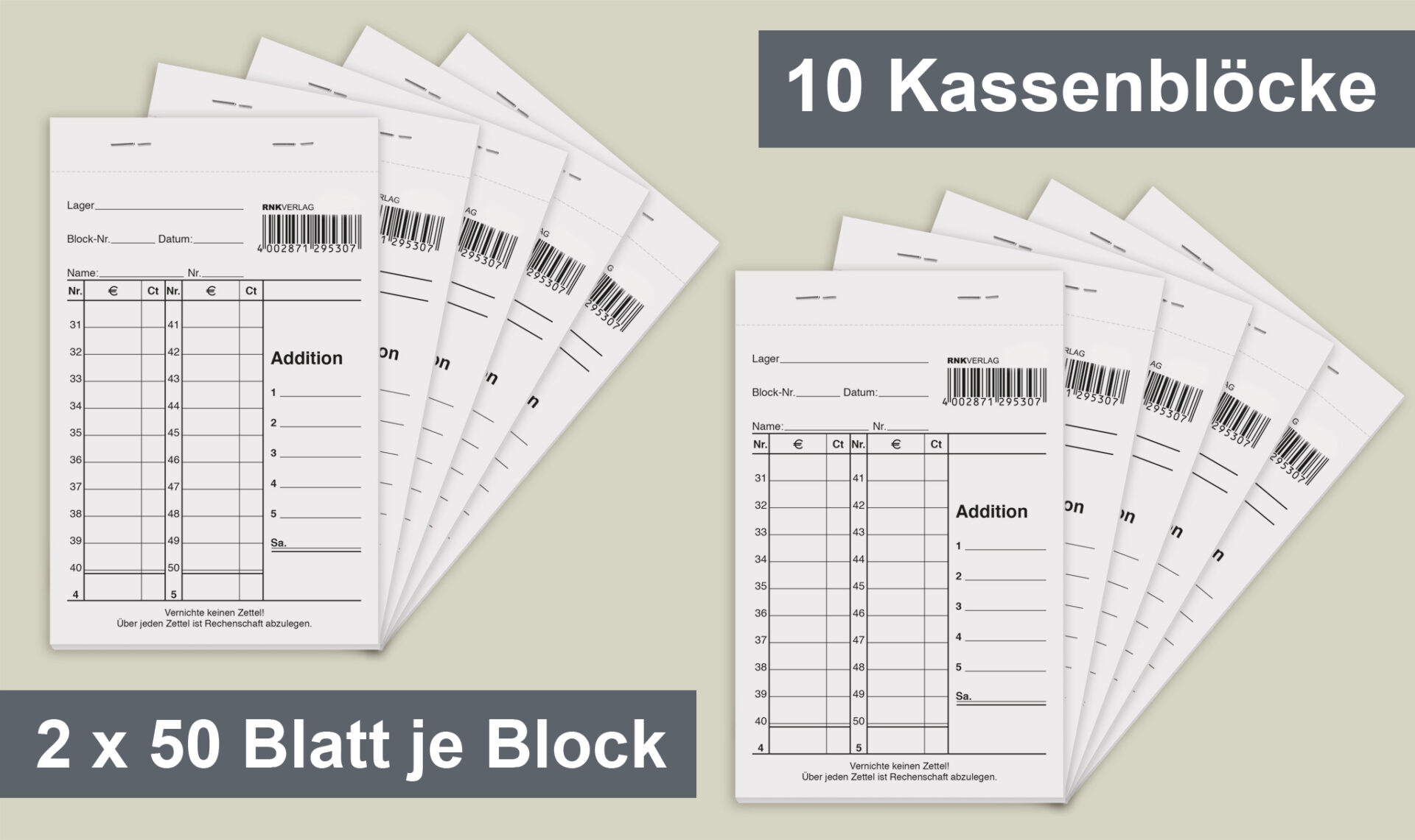 10 Kassenblöcke – mit Nummerierung, unten geheftet