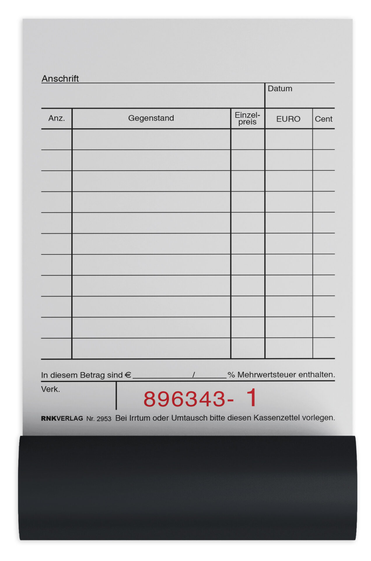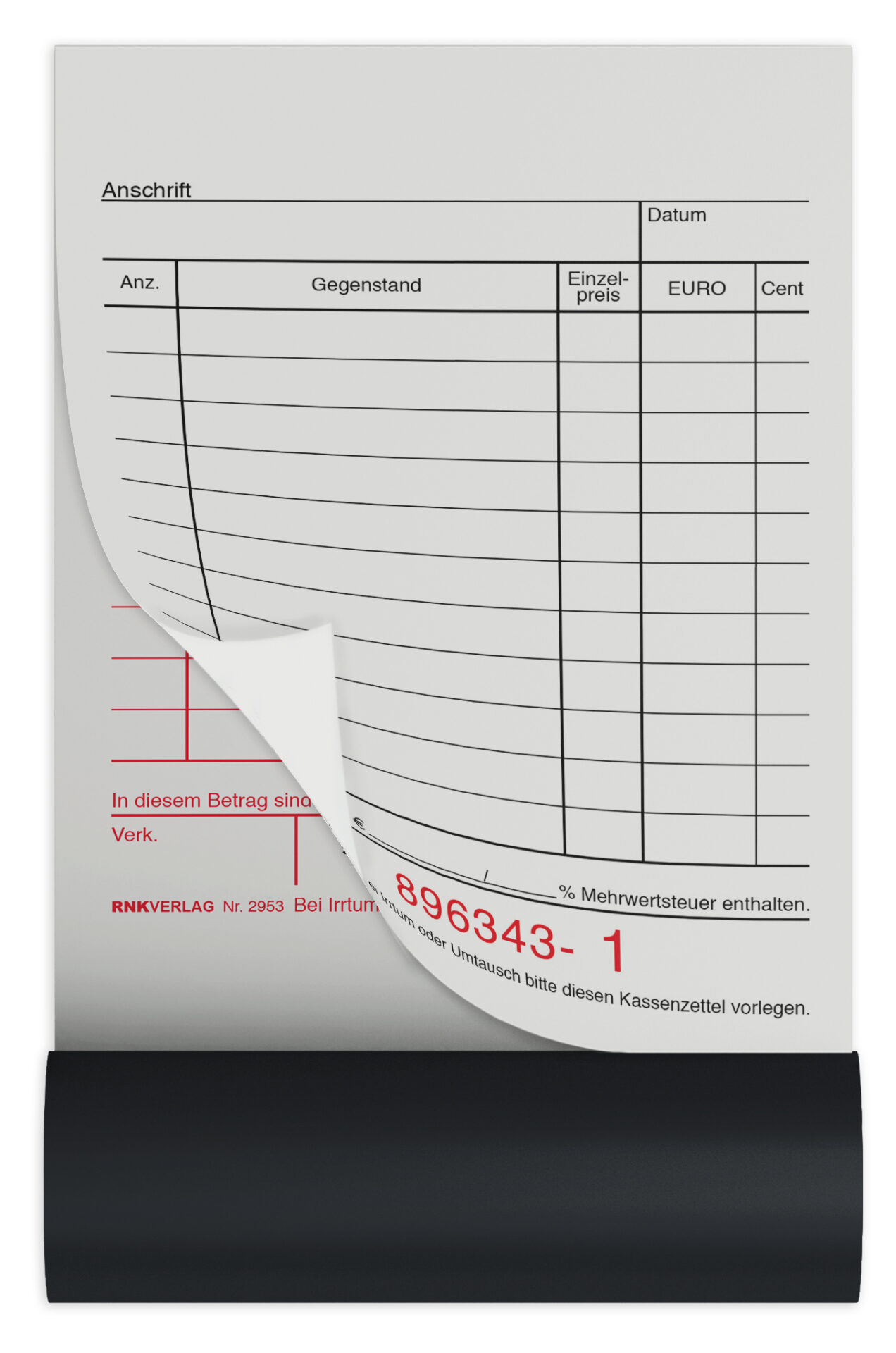 Der unten zusammengeheftete Kassenzettel enthält bis zu acht Abrechnungspositionen mit Menge, Bezeichnung (Gegenstand), Einzelpreis und Gesamtbetrag. Der Mehrwertsteuerausweis ist enthalten. Jeder Block verfügt über ein schwarzes Kohlepapier für die Durchschrift des Kassenzettels sowie über ein Abrechnungsblatt zur Addition der Belege. Die aufgehefteten Blätter bestehen aus Naturpapier, sind selbstdurchschreibend und einfarbig: Original in Schwarz, Durchschrift in Rot. In Deutschland besteht weiterhin keine Pflicht zur elektronischen Kasse.