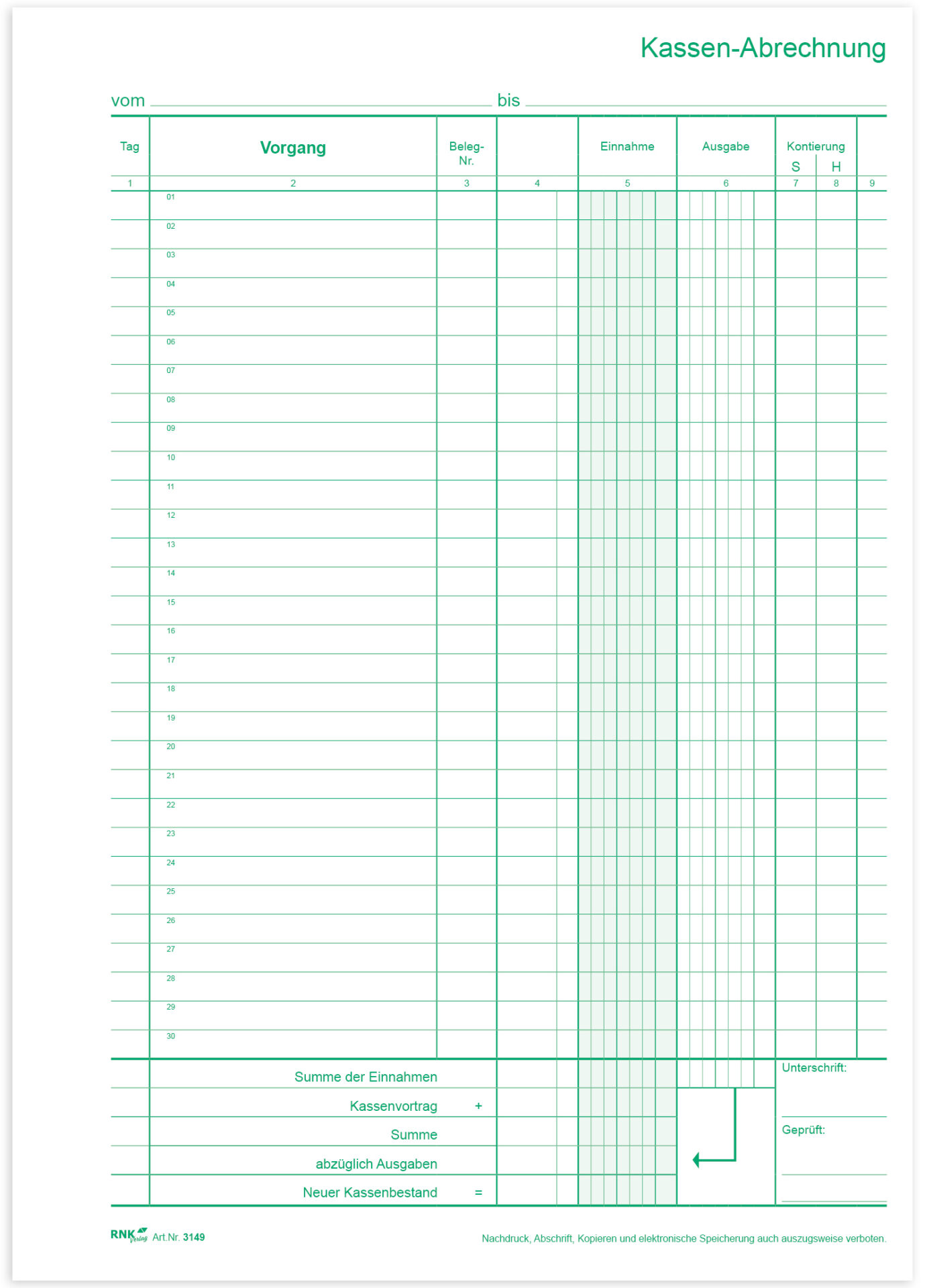 Das Kassenbuch im DIN-A4-Format ermöglicht eine komfortable und zuverlässige Erfassung aller Kassenbewegungen. Darin können Einnahmen und Ausgaben mit Vorgangsbezeichnung, Belegnummer, Betrag und Zuordnung der Buchung zu einem Buchungskonto (Kontierung) festgehalten werden. Mit Seitenaufrechnung und Berechnung des neuen Kassenbestandes und inkl. Nummerierung von 1 bis 50. So lassen sich alle Daten vollständig und nachvollziehbar dokumentieren. Das Kassenbuch besteht aus 2 x 50 Blatt: Das erste Blatt ist weiß und verbleibt im Buch zur Dokumentation, das zweite Blatt ist ebenfalls weiß, mit Perforation und Lochung zum Heraustrennen. Jedes Buch enthält blaues Durchschreibepapier, für sofortige Originalkopien.