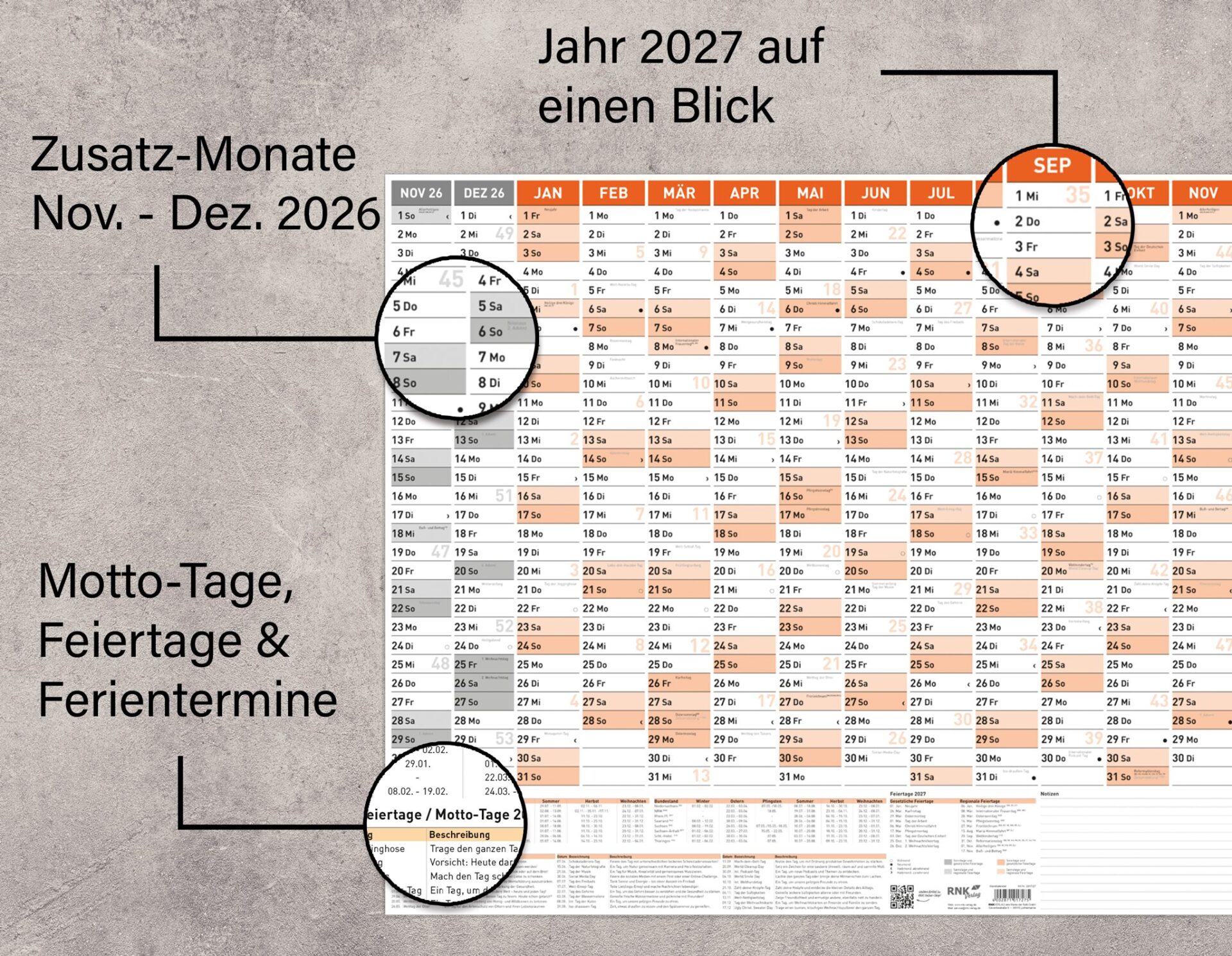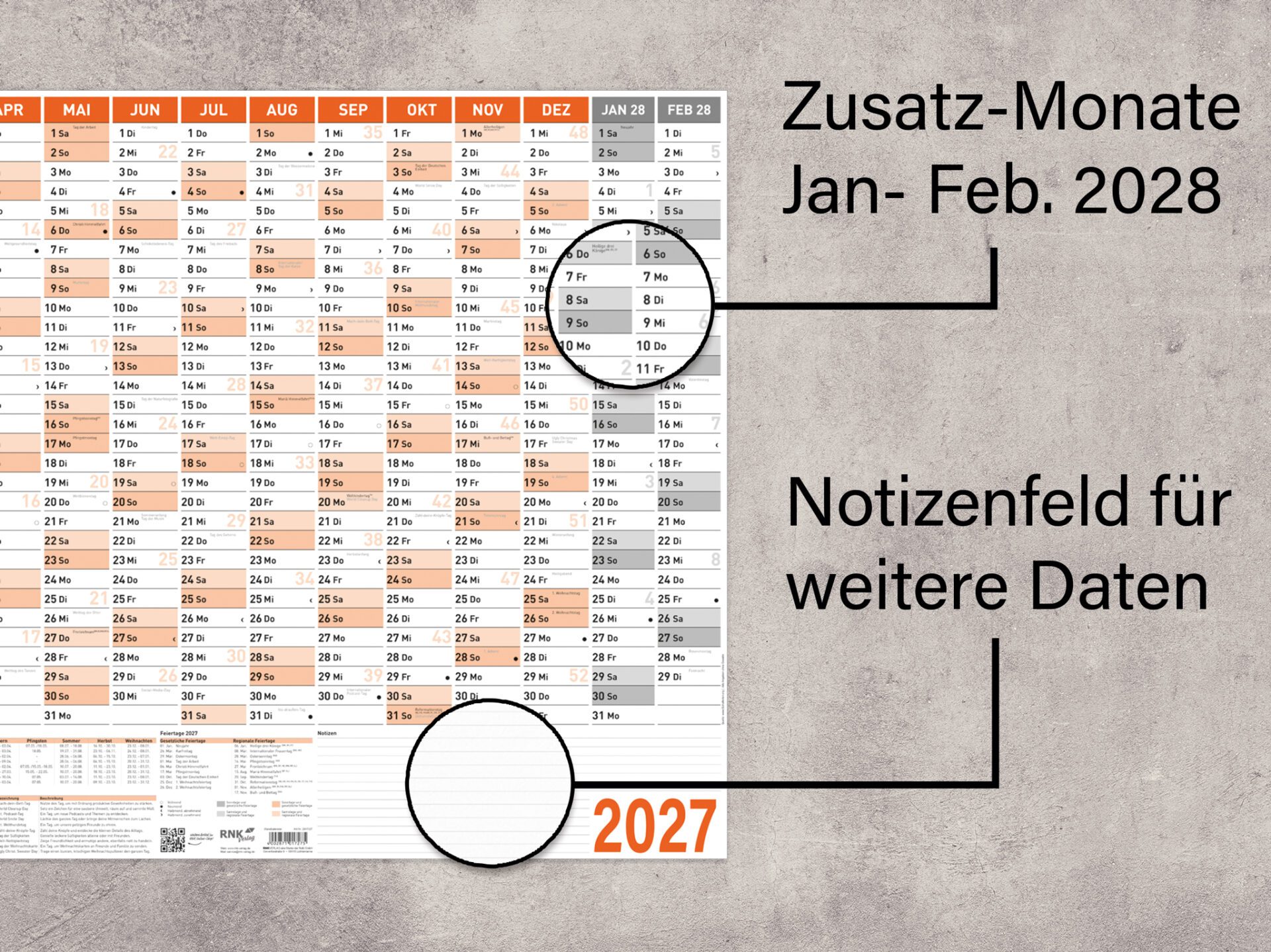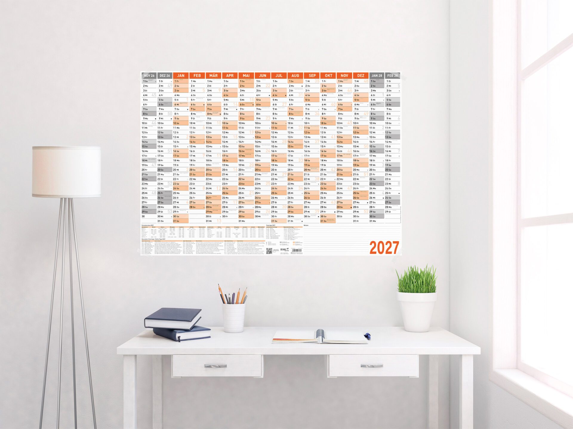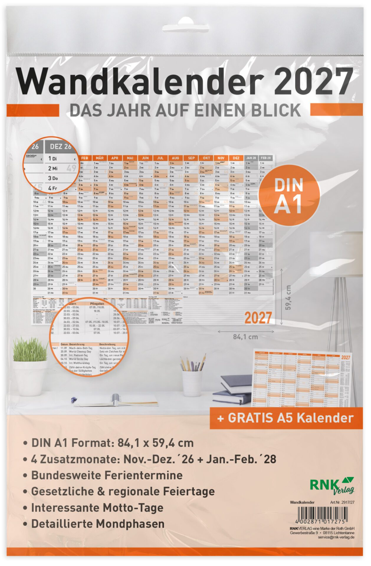 Der praktische DIN A1-Wandkalender für das Jahr 2027 im modernen Design mit allen Ferienterminen und Feiertagen, besonderen Thementagen, Mondphasen und vier Extra-Monaten. Der Jahreskalender ist kompakt auf DIN A4 gefaltet und in einem schützenden Folienbeutel verpackt. Ein gratis DIN A5-Kalender ist inklusive. Der Wandkalender eignet sich ideal für die Planung & Organisation wichtiger Daten und Termine.