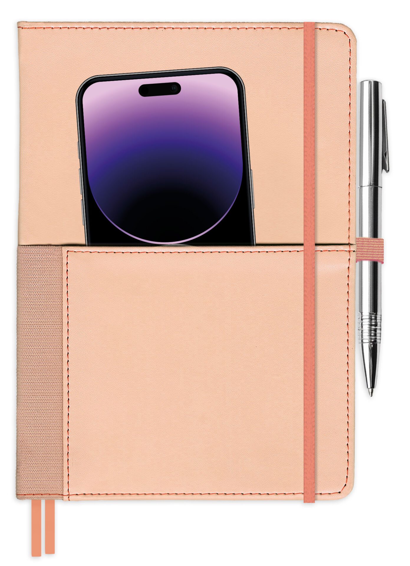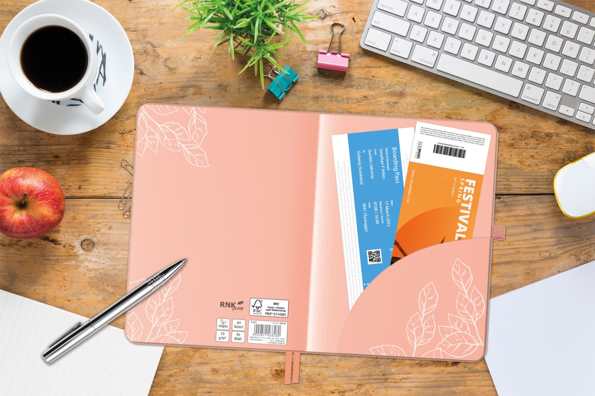 Das RNK-Notizbuch aus Apfelschalen vereint eine nachhaltige Herstellung mit stilvollem Design. Der Einband ist aus pflanzlichem Leder gefertigt, welches aus natürlichen Apfelschalen hergestellt wurde. Die vegane Ledertextur im modernen Pastellgelb sorgt für ein elegantes Erscheinungsbild und eine angenehme Haptik. Das Buch ist mit einem Gummizug zum sicheren Verschließen, zwei Lesebändern zum schnellen Auffinden und Organisieren der Notizen sowie einer Innentasche für lose Zettel, einem Stifthalter und einem Smart Pocket für das Smartphone auf der Frontseite ausgestattet. Das Buch verfügt über 96 Blatt (75 g/m²) und ist in der Lineatur „liniert“ erhältlich. Es eignet sich für alle, die Notizen, Ideen und Skizzen umweltbewusst festhalten möchten.
