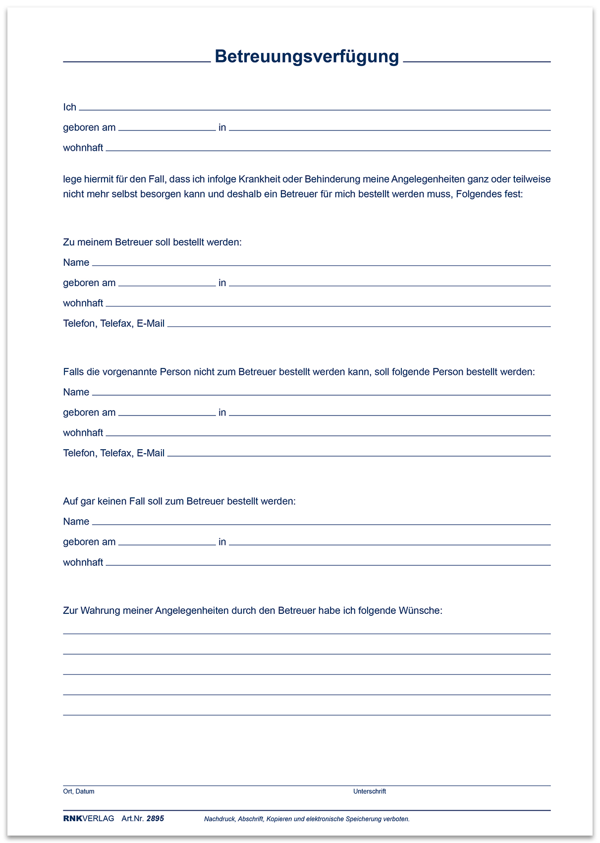 Die Patientenverfügung wird von Ärzten für jeden Menschen in Deutschland ab 18 Jahren empfohlen. Sie enthält neben der Patientenverfügung jeweils eine Vorsorgevollmacht, Betreuungsverfügung und Anmeldung zum Zentralen Vorsorgeregister. Außerdem sind eine neu gestaltete Hinweiskarte für die Brieftasche mit Organspendeausweis sowie umfassende Erläuterungen im FAQ-Stil enthalten.
